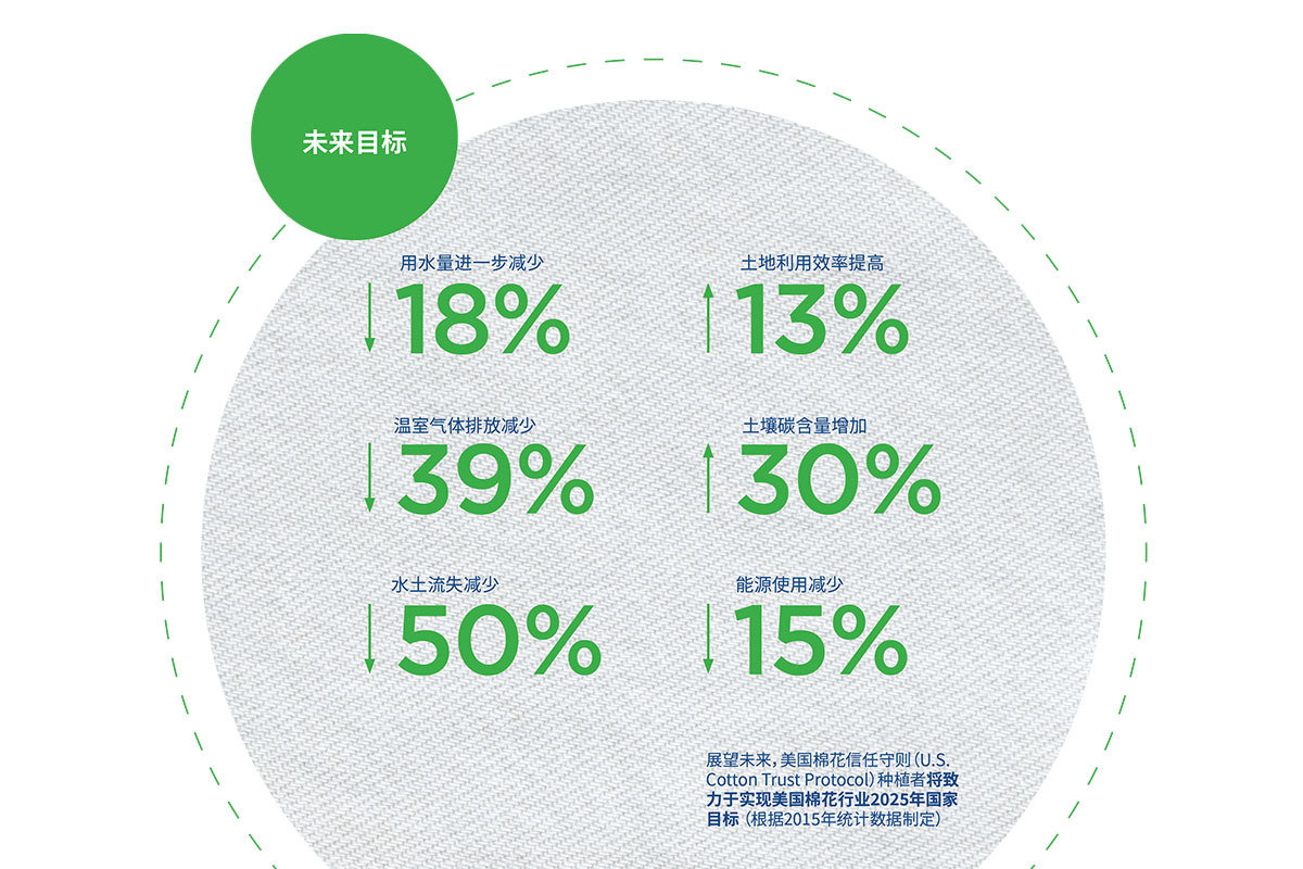 美国棉花行业制定了雄心勃勃的环境影响目标,而信任守则(Trust Protocol)是通向更大成功的途径之一。信任守则(Trust Protocol)在土地使用、土壤保护、能源使用、温室气体排放、土壤碳含量和灌溉用水方面的六项持续改进指标与美国棉花行业的2025年国家目标一致。